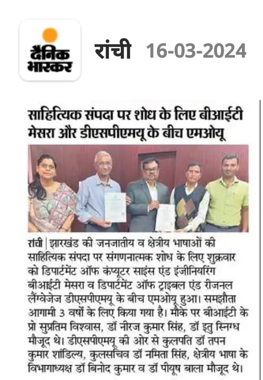 The MoU is made on 15 March 2024 between Department of Computer Science and Engineering, Birla Institute of Technology Mesra, Ranchi- 835215 and Department of Tribal and Regional Languages, Dr. Shyama Prasad Mukherjee University, Morahabadi, Ranchi.